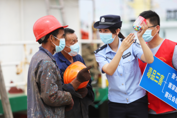 “6·26”國(guó)際禁毒日臨近,浙江省臺(tái)州市路橋區(qū)金清鎮(zhèn)禁毒辦把六月定為“禁毒宣傳月”,組織公安民警、禁毒社工等進(jìn)村居、企業(yè)、學(xué)校、碼頭開(kāi)展禁毒宣傳,普及禁毒法規(guī),共筑禁毒長(zhǎng)城。圖為6月8日,金清派出所民警在漁港碼頭向休漁期維修漁船和織網(wǎng)補(bǔ)網(wǎng)的漁民宣傳毒品危害及禁毒法規(guī)。