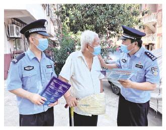 圖② 曹金生(右一)向轄區(qū)老人宣傳防范養(yǎng)老詐騙知識(shí)。