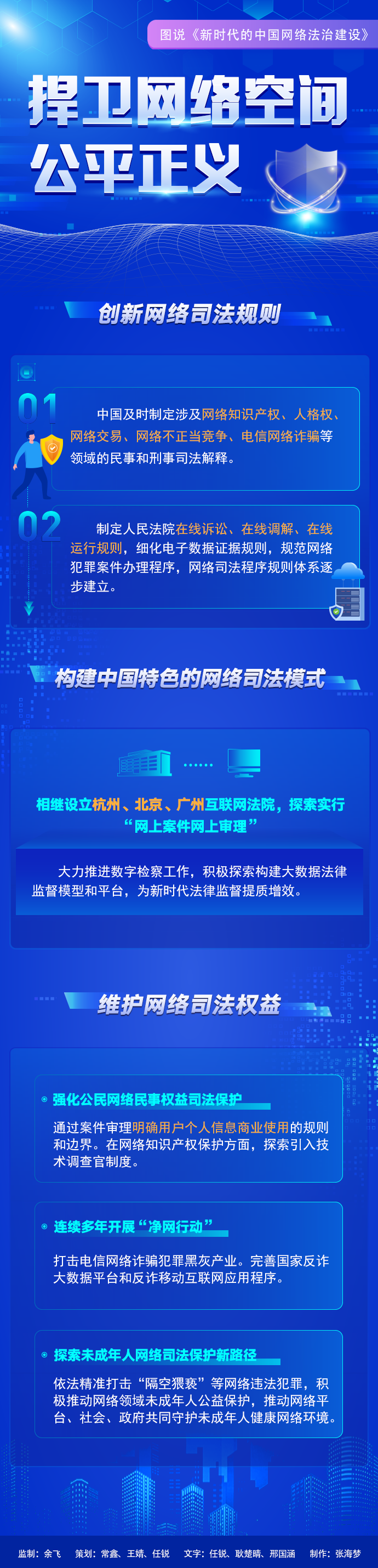 互聯(lián)網(wǎng)是人類文明發(fā)展的重要成果,法治是互聯(lián)網(wǎng)治理的基本方式。長(zhǎng)期以來(lái),我國(guó)堅(jiān)持依法治網(wǎng),持續(xù)推進(jìn)網(wǎng)絡(luò)空間法治化,推動(dòng)互聯(lián)網(wǎng)在法治軌道上健康運(yùn)行。3月16日,國(guó)務(wù)院新聞辦公室發(fā)布《新時(shí)代的中國(guó)網(wǎng)絡(luò)法治建設(shè)》白皮書,讓我們一起來(lái)看如何捍衛(wèi)網(wǎng)絡(luò)空間公平正義。
