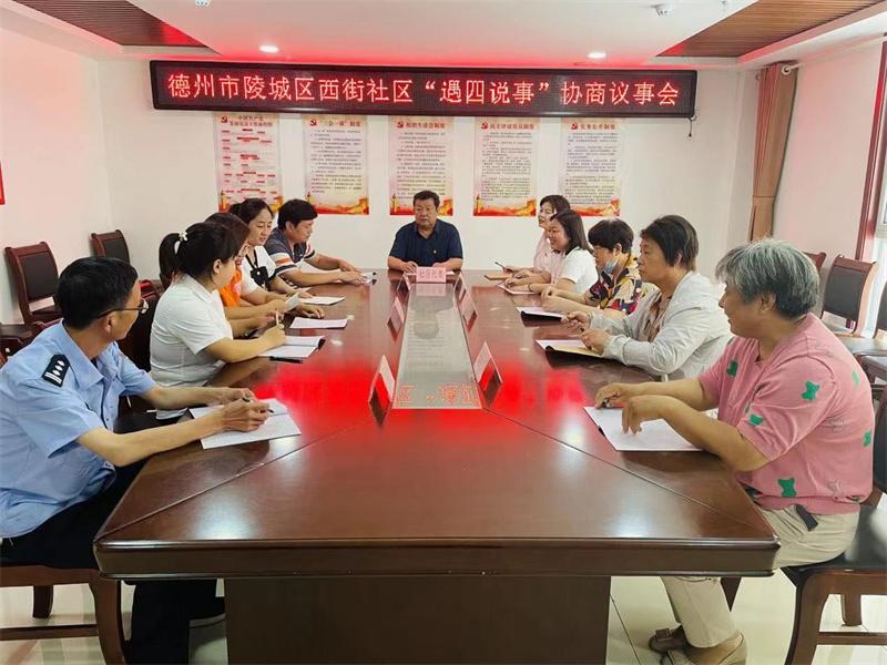 圖為陵城區(qū)建立“遇四說事”協(xié)商議事機(jī)制,每月4日、14日、24日由社區(qū)召集居民代表、業(yè)委會、物業(yè)召開會議,暢通問題反饋渠道,共商難題破解辦法