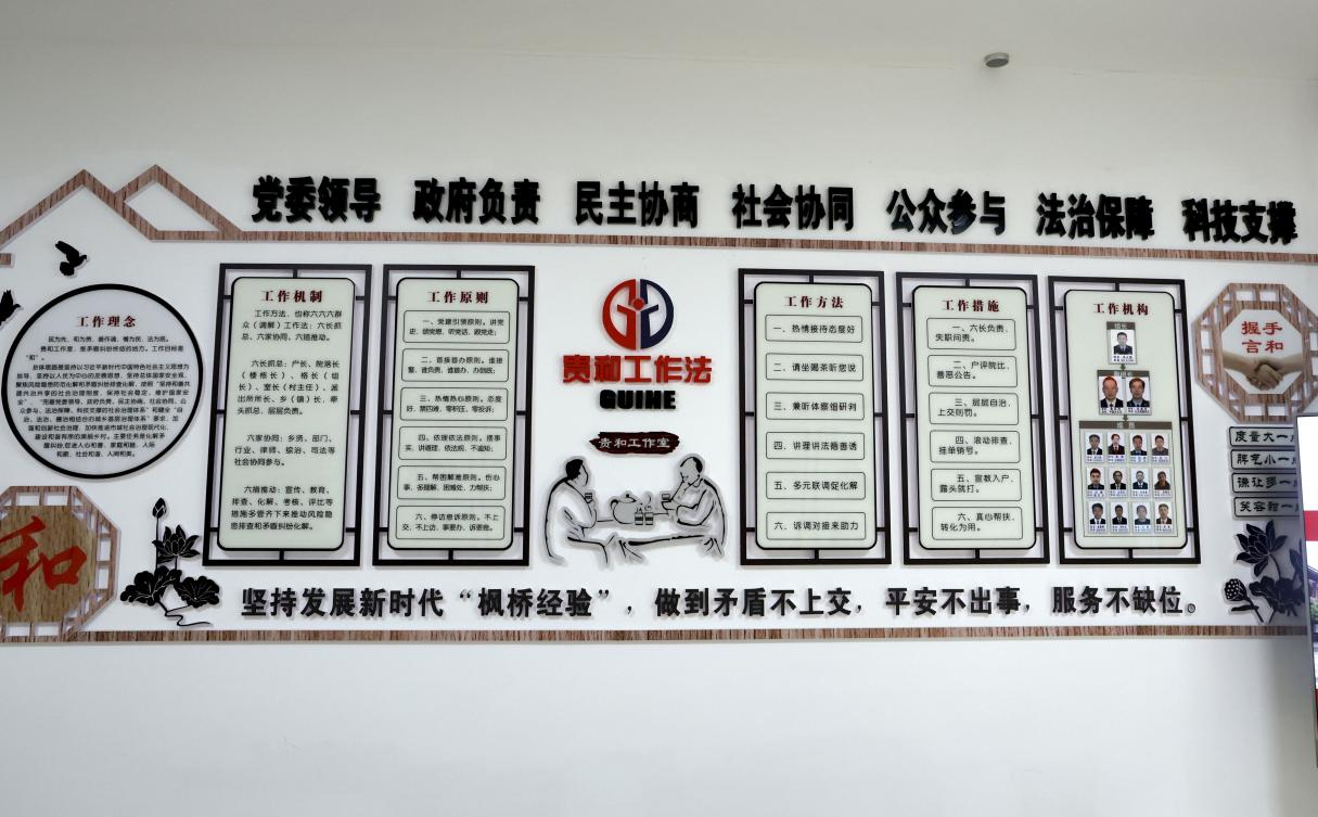 一個(gè)目標(biāo)是“和”,在貴和工作室,矛盾糾紛一站式接收、一攬子調(diào)處、全鏈條解決。兩種手段,是運(yùn)用現(xiàn)代科技智能手段和傳統(tǒng)群眾工作手段。三大保障,是發(fā)揮黨組織三大作用,以保障貴和工作法得以推進(jìn)實(shí)施。四個(gè)重點(diǎn),是以管住“人”為中心,聚集防范風(fēng)險(xiǎn)、化解矛盾、整改隱患、管控人員四個(gè)重點(diǎn)?!拔逯巍本褪翘N(yùn)含國(guó)家治理方式現(xiàn)代化新要求的政治引領(lǐng)、法治保障、德治教化、自治強(qiáng)基、智治支撐。