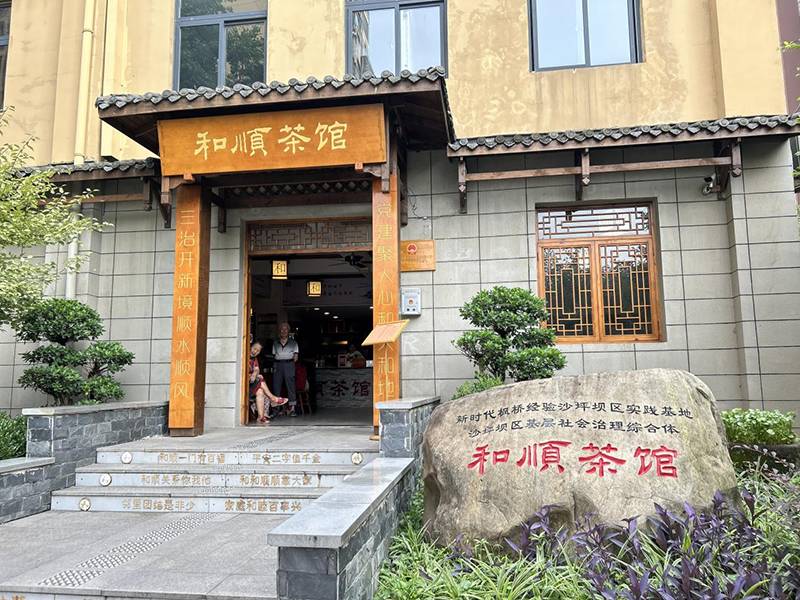 采訪團(tuán)到達(dá)重慶當(dāng)天,就來到了重慶赫赫有名的“和順茶館”。一下車,茶館門前的黨建、紅色文化、法治文化宣傳廊就映入眼簾。