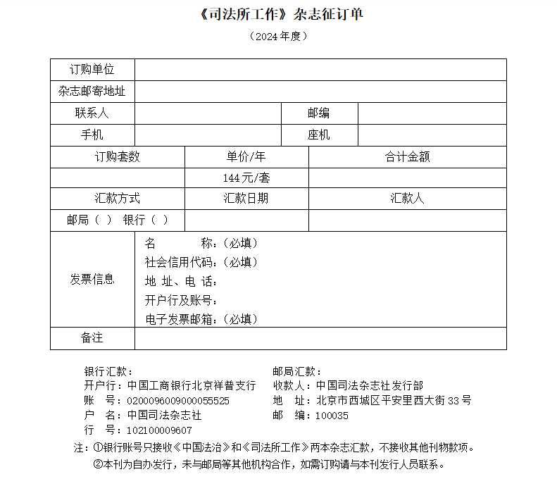 若不能進(jìn)行在線提交訂單,請(qǐng)將本征訂單填寫完整后與匯款憑證一并發(fā)郵件至sfsgzfxb@126.com;或添加微信13681283507后發(fā)送電子版征訂單與匯款憑證。