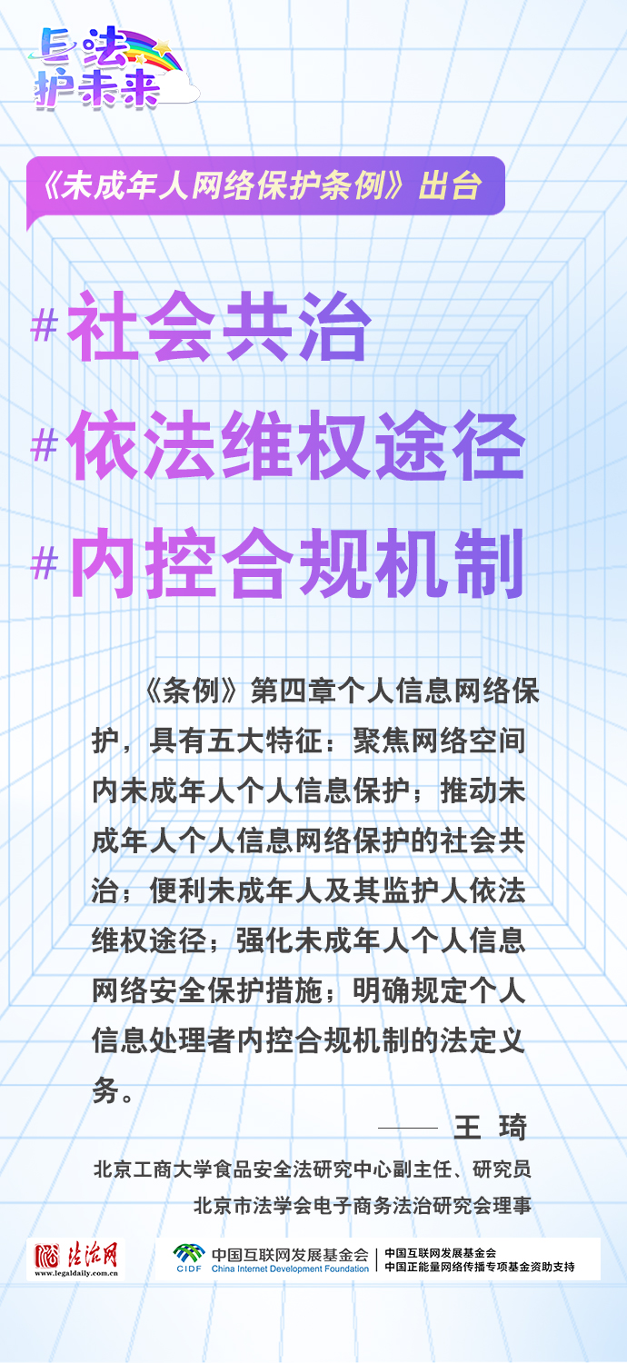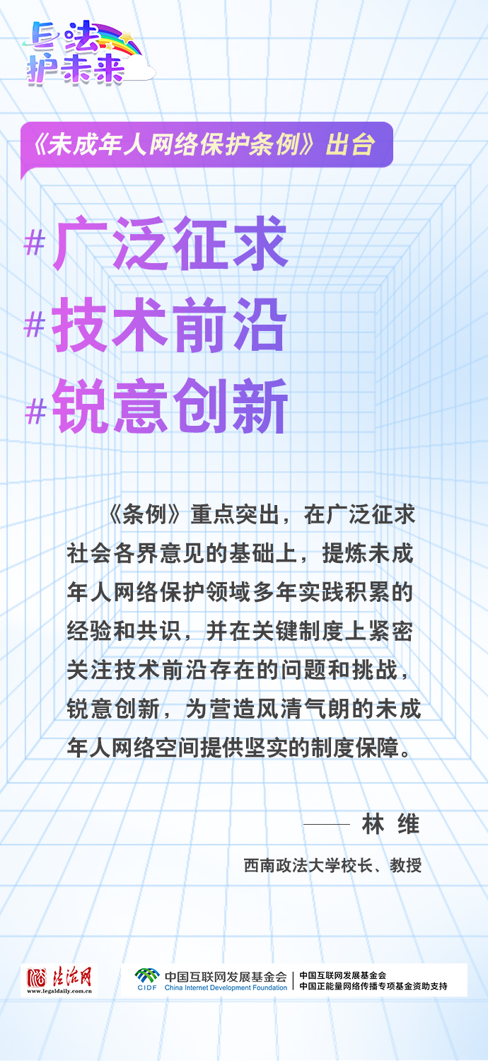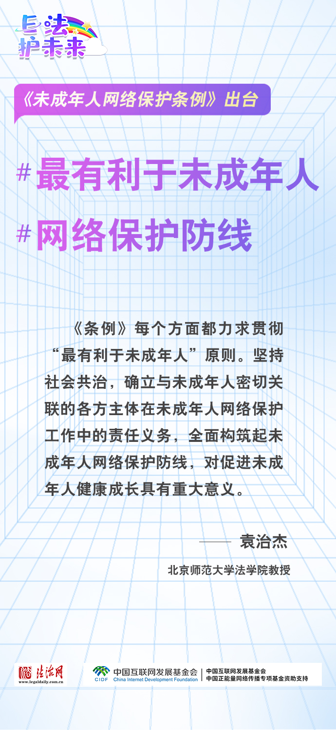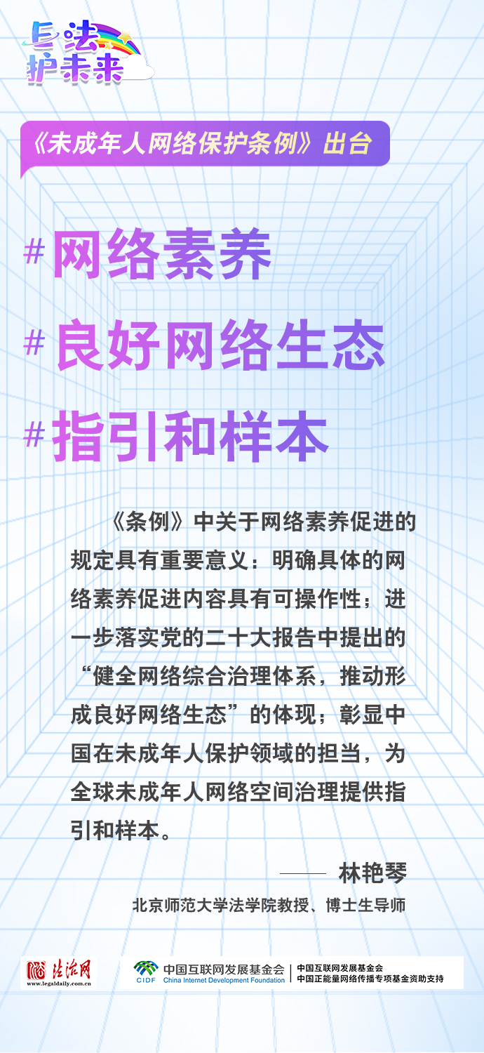 法治網(wǎng)特推出一組“專家有言”海報(bào),內(nèi)容涵蓋《條例》出臺的現(xiàn)實(shí)意義和時代價(jià)值、網(wǎng)絡(luò)素養(yǎng)促進(jìn)、網(wǎng)絡(luò)信息內(nèi)容規(guī)范、個人信息網(wǎng)絡(luò)保護(hù)、網(wǎng)絡(luò)沉迷防治等,充分展現(xiàn)《條例》的出臺是我國互聯(lián)網(wǎng)治理領(lǐng)域的法治成果,彰顯中國在未成年人網(wǎng)絡(luò)保護(hù)領(lǐng)域的擔(dān)當(dāng),為全球未成年人網(wǎng)絡(luò)空間治理提供指引和樣本。