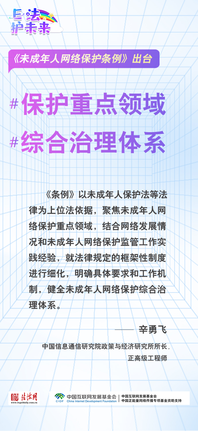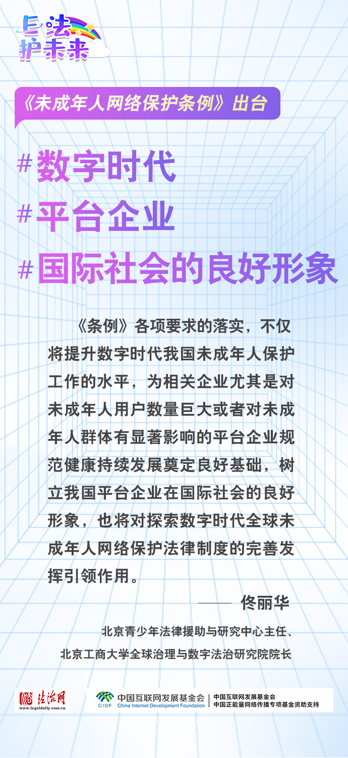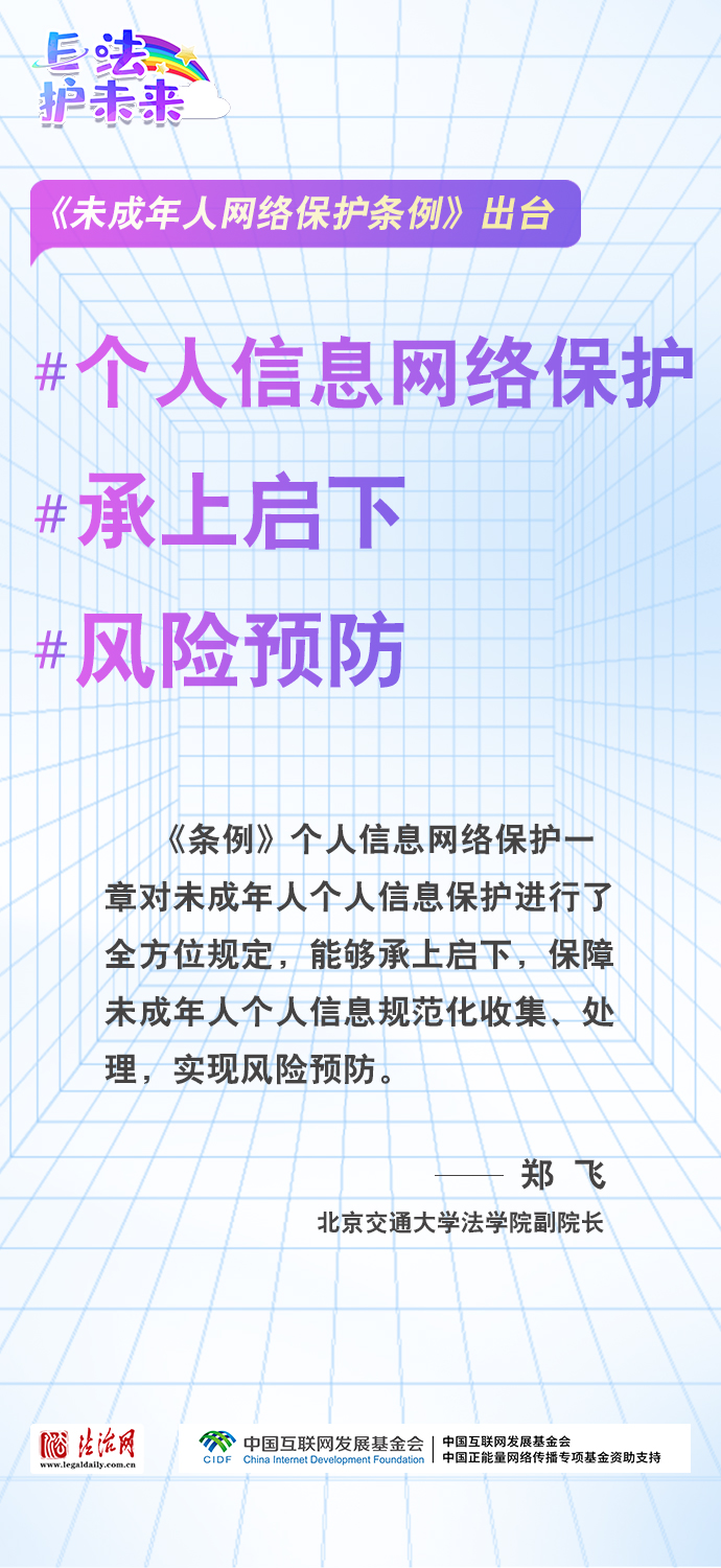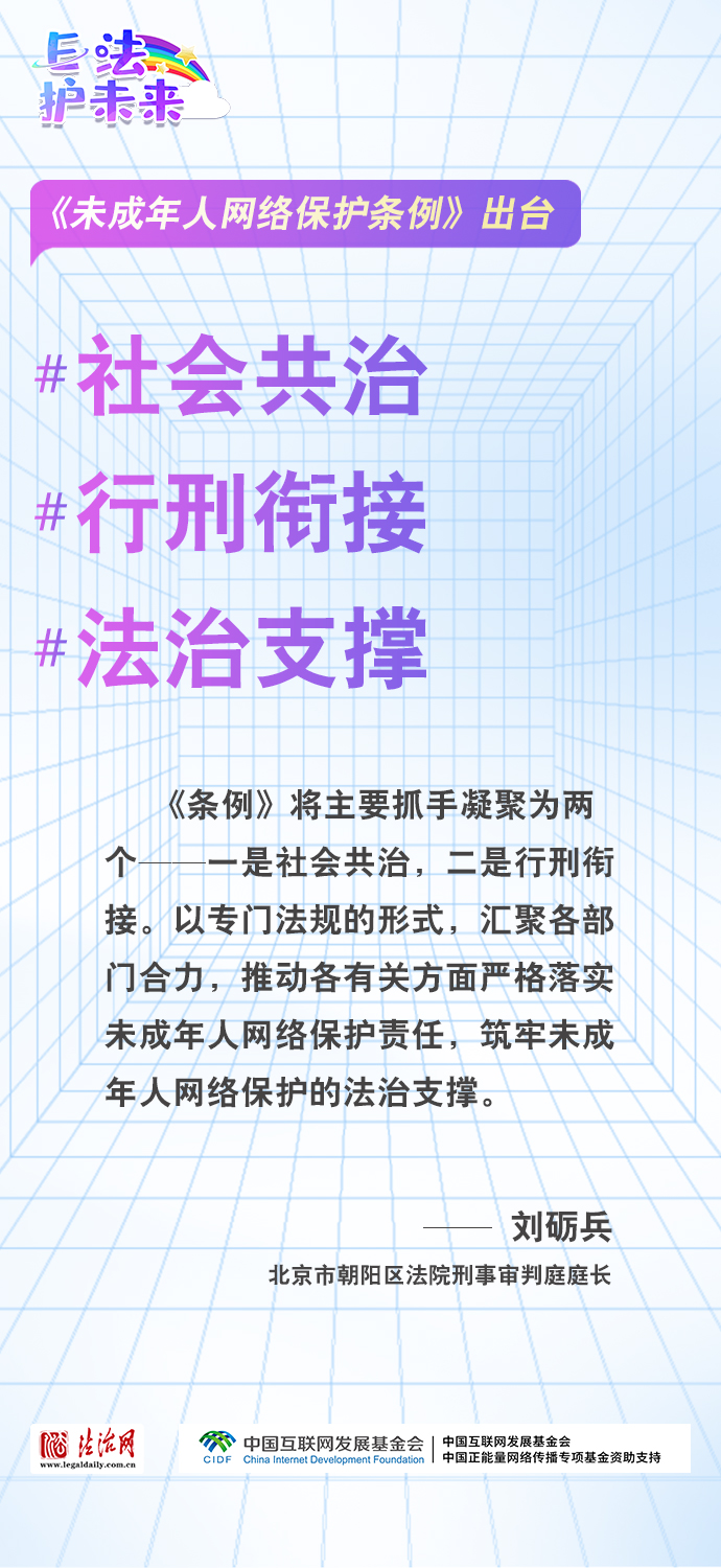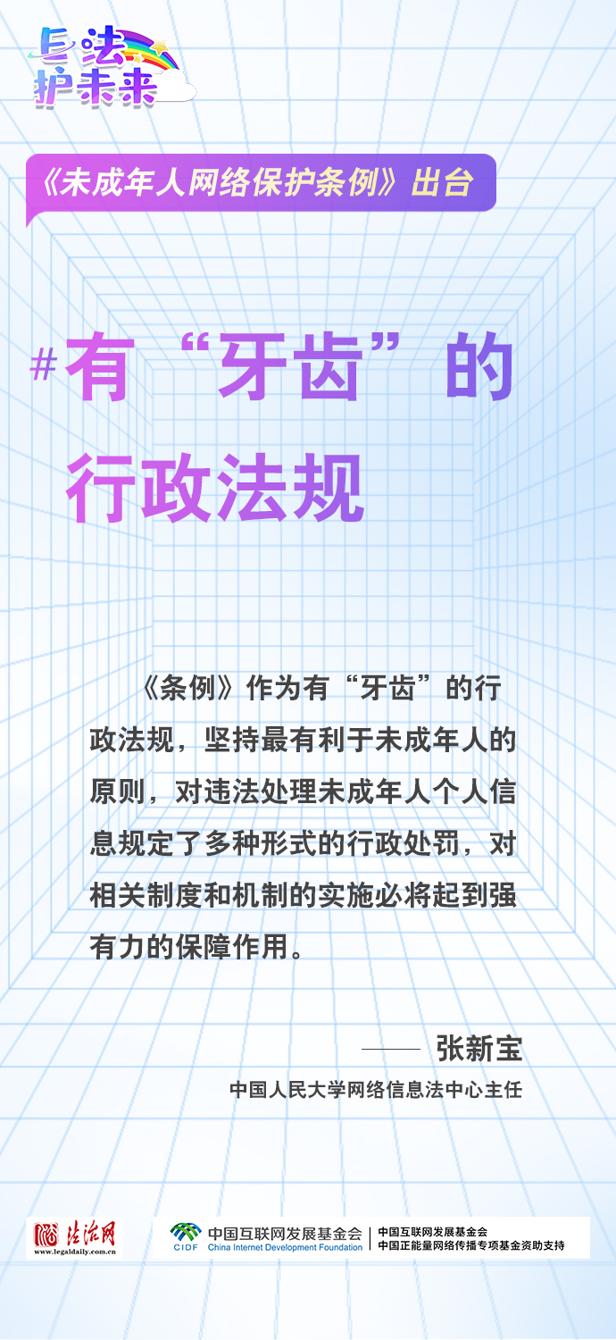 法治網(wǎng)特推出一組“專家有言”海報(bào),內(nèi)容涵蓋《條例》出臺的現(xiàn)實(shí)意義和時代價(jià)值、網(wǎng)絡(luò)素養(yǎng)促進(jìn)、網(wǎng)絡(luò)信息內(nèi)容規(guī)范、個人信息網(wǎng)絡(luò)保護(hù)、網(wǎng)絡(luò)沉迷防治等,充分展現(xiàn)《條例》的出臺是我國互聯(lián)網(wǎng)治理領(lǐng)域的法治成果,彰顯中國在未成年人網(wǎng)絡(luò)保護(hù)領(lǐng)域的擔(dān)當(dāng),為全球未成年人網(wǎng)絡(luò)空間治理提供指引和樣本。