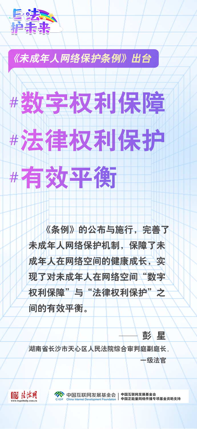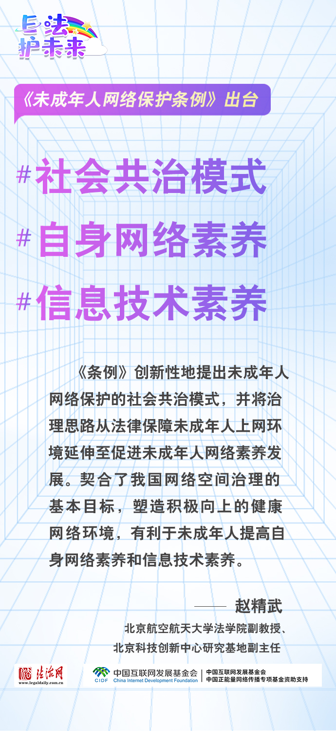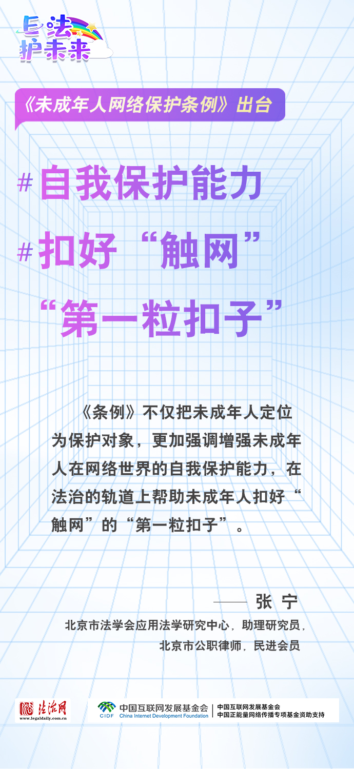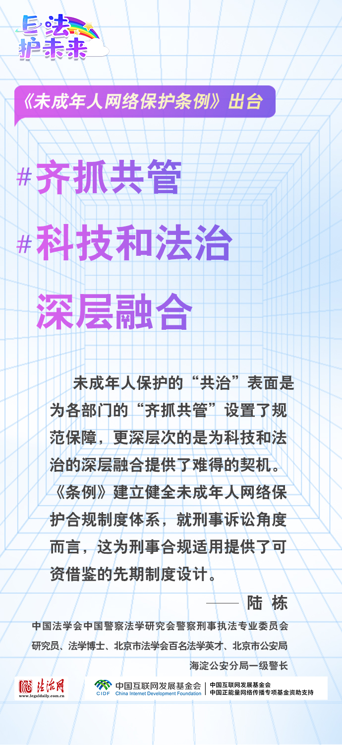 法治網(wǎng)特推出一組“專家有言”海報(bào),內(nèi)容涵蓋《條例》出臺的現(xiàn)實(shí)意義和時代價(jià)值、網(wǎng)絡(luò)素養(yǎng)促進(jìn)、網(wǎng)絡(luò)信息內(nèi)容規(guī)范、個人信息網(wǎng)絡(luò)保護(hù)、網(wǎng)絡(luò)沉迷防治等,充分展現(xiàn)《條例》的出臺是我國互聯(lián)網(wǎng)治理領(lǐng)域的法治成果,彰顯中國在未成年人網(wǎng)絡(luò)保護(hù)領(lǐng)域的擔(dān)當(dāng),為全球未成年人網(wǎng)絡(luò)空間治理提供指引和樣本。
