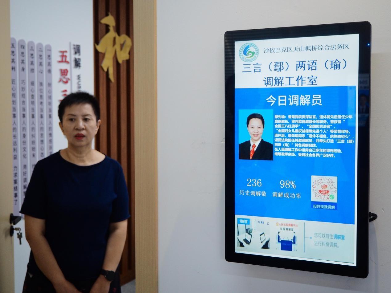 在新疆烏魯木齊市沙依巴克區(qū)“天山楓橋”綜合法務區(qū),有一個“三言(鄢)兩語(瑜)調(diào)解工作室”,鄢先瑜就在這里,完成了數(shù)百件婚姻家事案件的訴前調(diào)解。