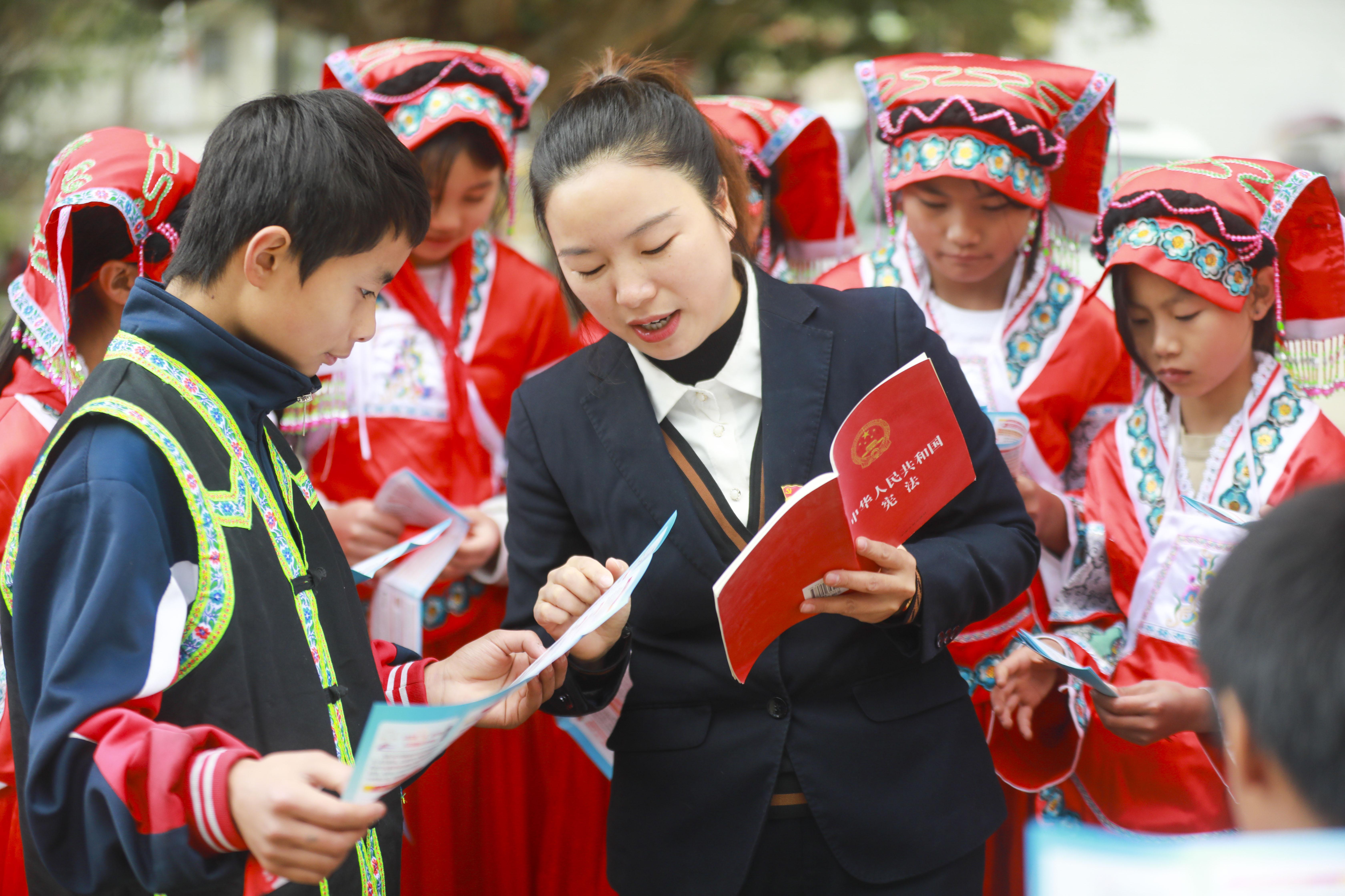 11月26日,貴州省黔西市司法局組織工作人員走進(jìn)轄區(qū)鐘山鎮(zhèn)錦崗小學(xué)和治中小學(xué),開(kāi)展憲法知識(shí)進(jìn)校園活動(dòng)。圖為司法局工作人員向治中小學(xué)學(xué)生講解憲法知識(shí)。 通訊員 周訓(xùn)超 攝