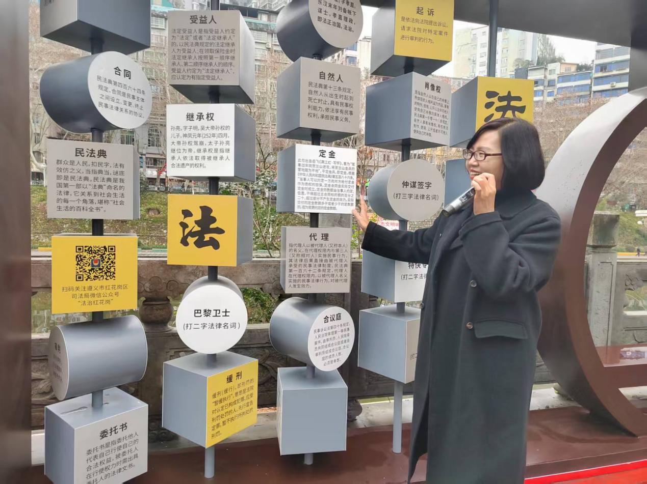 “穿過這條居民小巷,就能到達遵義會議會址的出口處,這條小巷就是‘紀念館社區(qū)民法典主題街’?!笔忻窆渴且幻麍?zhí)業(yè)律師,專程帶孩子來主題街學(xué)法。她告訴記者,主題街以民法典為核心內(nèi)容,聚焦物業(yè)糾紛、消費者權(quán)益保護、婚姻家庭等與居民群眾生活密切相關(guān)的法律問題,通過漫畫解析、以案說法的形式,將條文轉(zhuǎn)化為通俗易懂的內(nèi)容,把法律精神與價值融入群眾日常生活,孩子聽得懂也記得住。