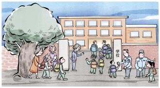 “李姐,今天下雨,多注意?!贝骷t袖標的鐘老師走過來提醒道。他是學校派駐校門口的“安全員”,負責協(xié)調(diào)校門口的安全事務。