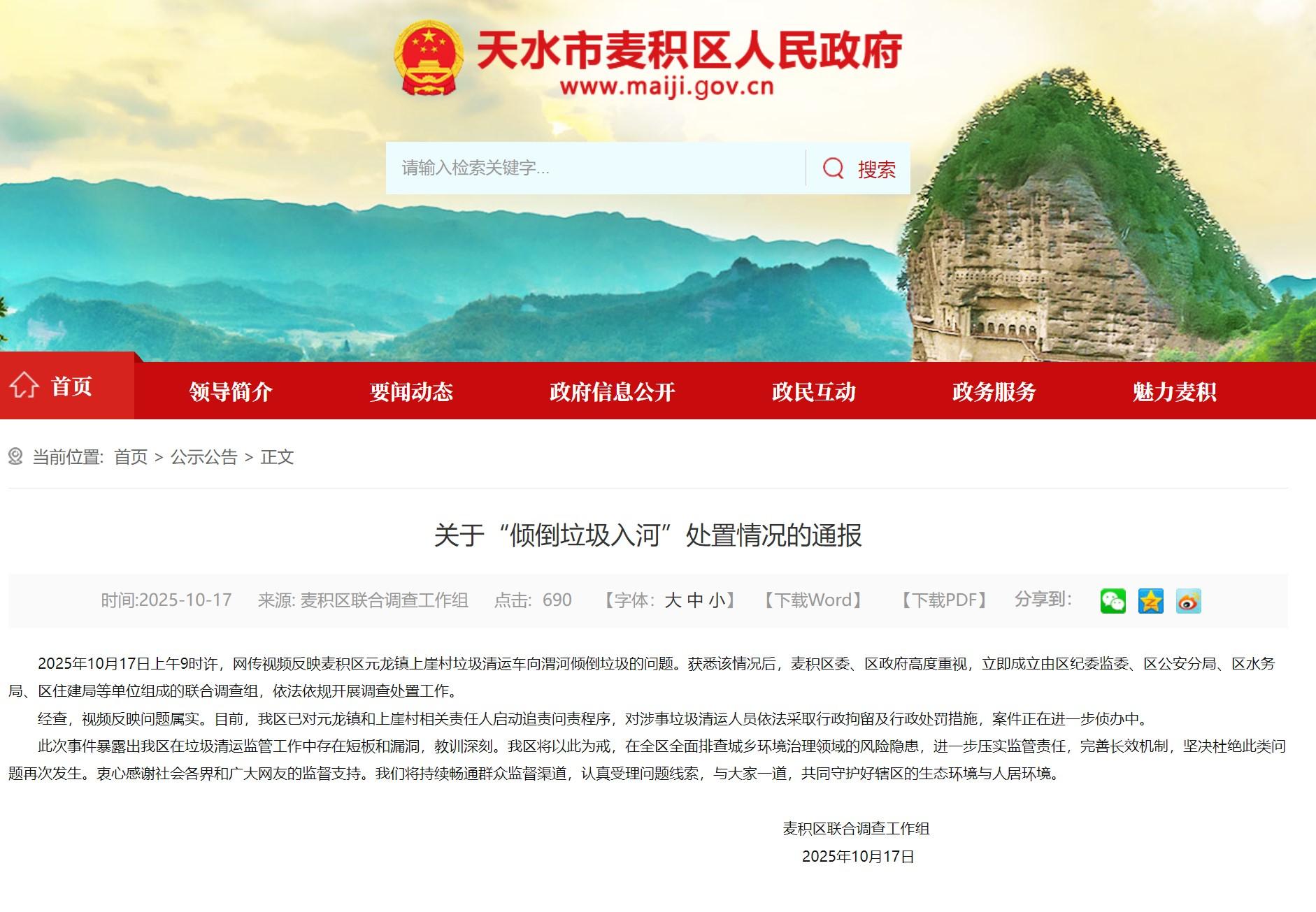 2025年10月17日上午9時(shí)許,網(wǎng)傳視頻反映麥積區(qū)元龍鎮(zhèn)上崖村垃圾清運(yùn)車向渭河傾倒垃圾的問(wèn)題。獲悉該情況后,麥積區(qū)委、區(qū)政府高度重視,立即成立由區(qū)紀(jì)委監(jiān)委、區(qū)公安分局、區(qū)水務(wù)局、區(qū)住建局等單位組成的聯(lián)合調(diào)查組,依法依規(guī)開展調(diào)查處置工作。