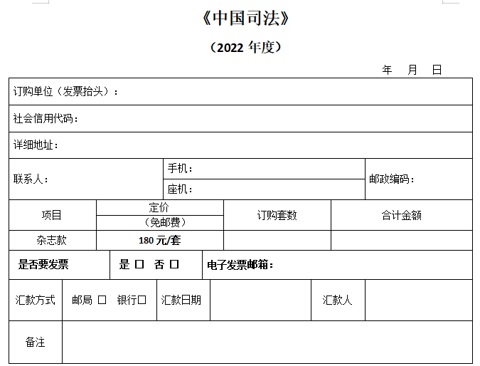 單位匯款時(shí)請(qǐng)務(wù)必標(biāo)明“中國(guó)司法+訂購(gòu)套數(shù)”,個(gè)人匯款請(qǐng)務(wù)必注明“單位名稱+中國(guó)司法”。