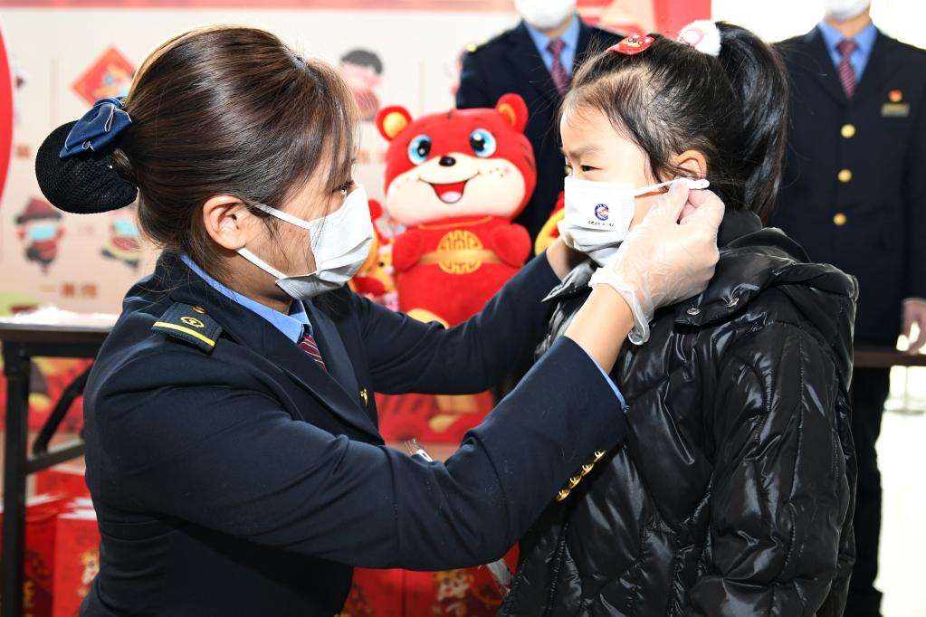 1月16日,在常州站候車(chē)室防疫宣傳活動(dòng)現(xiàn)場(chǎng),鐵路工作人員為候車(chē)小朋友戴好口罩。新華社發(fā)(史康 攝)