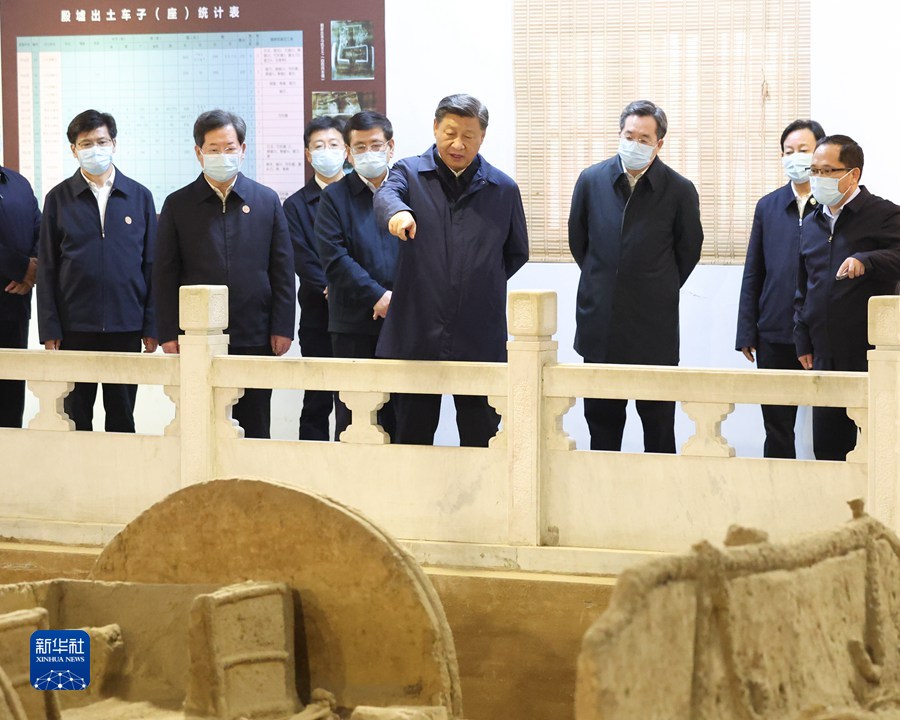 28日下午,習(xí)近平考察了位于安陽市西北郊洹河南北兩岸的殷墟遺址。殷墟是我國歷史上第一個(gè)文獻(xiàn)可考、為考古發(fā)掘所證實(shí)的商代晚期都城遺址。習(xí)近平步入殷墟博物館,仔細(xì)觀摩青銅器、玉器、甲骨文等出土文物。隨后,習(xí)近平來到車馬坑展廳,察看商代畜力車實(shí)物標(biāo)本和道路遺跡。他指出,殷墟出土的甲骨文為我們保存3000年前的文字,把中國信史向上推進(jìn)了約1000年。殷墟我向往已久,這次來是想更深地學(xué)習(xí)理解中華文明,古為今用,為更好建設(shè)中華民族現(xiàn)代文明提供借鑒。中國的漢文字非常了不起,中華民族的形成和發(fā)展離不開漢文字的維系。在這方面,考古事業(yè)居功至偉。考古工作要繼續(xù)重視和加強(qiáng),繼續(xù)深化中華文明探源工程。中華文明源遠(yuǎn)流長(zhǎng),從未中斷,塑造了我們偉大的民族,這個(gè)民族還會(huì)偉大下去的。要通過文物發(fā)掘、研究保護(hù)工作,更好地傳承優(yōu)秀傳統(tǒng)文化。習(xí)近平強(qiáng)調(diào),中華優(yōu)秀傳統(tǒng)文化是我們黨創(chuàng)新理論的“根”,我們推進(jìn)馬克思主義中國化時(shí)代化的根本途徑是“兩個(gè)結(jié)合”。我們要堅(jiān)定文化自信,增強(qiáng)做中國人的自信心和自豪感。
