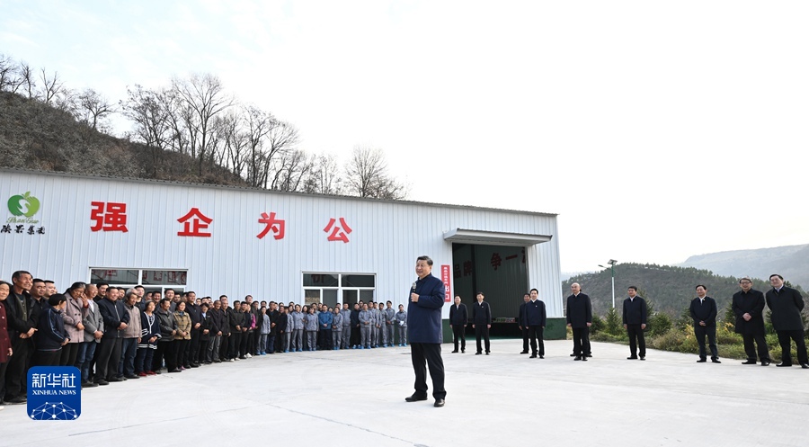 車間外,老鄉(xiāng)們聚集在一起,高聲向總書記問好。習(xí)近平同老鄉(xiāng)們拉起家常,回憶當(dāng)年他在陜北的知青歲月。習(xí)近平對(duì)老鄉(xiāng)們說,我在陜北生活了7年,當(dāng)年看到老鄉(xiāng)們生活很艱苦,心里就想著怎么樣讓大家生活好起來。這次來延安,看到一派碩果累累的豐收景象,交通條件大為改善,發(fā)生了翻天覆地的變化。過去陜北老鄉(xiāng)們修梯田、種莊稼,面朝黃土背朝天,掄起老鋤頭干活,廣種薄收,十分辛苦,如今山坡上退耕還林種上了蘋果,老鄉(xiāng)們有工作、有穩(wěn)定收入,孩子有好的教育,老人都有醫(yī)保,生活越來越好。從陜北的變化就可以看到中國的變化。習(xí)近平指出,現(xiàn)在,“兩個(gè)一百年”奮斗目標(biāo)的第一個(gè)百年目標(biāo)已經(jīng)實(shí)現(xiàn),絕對(duì)貧困問題解決了,老鄉(xiāng)們過上了好日子,但還要繼續(xù)努力往前走,讓生活越來越美好。陜北的氣候、光照、緯度、海拔等非常適宜發(fā)展蘋果種植,加上滴灌技術(shù)、矮化種植技術(shù)、選果生產(chǎn)線等不斷發(fā)展,就地賣出,銷路不愁,大力發(fā)展蘋果種植業(yè)可謂天時(shí)地利人和,這是最好的、最合適的產(chǎn)業(yè),大有前途。習(xí)近平強(qiáng)調(diào),中國共產(chǎn)黨是人民的黨,是為人民服務(wù)的黨,共產(chǎn)黨當(dāng)家就是要為老百姓辦事,把老百姓的事情辦好??照?wù)`國,實(shí)干興邦。要認(rèn)真學(xué)習(xí)貫徹黨的二十大精神,全面推進(jìn)鄉(xiāng)村振興,把富民政策一項(xiàng)一項(xiàng)落實(shí)好,加快推進(jìn)農(nóng)業(yè)農(nóng)村現(xiàn)代化,讓老鄉(xiāng)們生活越來越紅火。老鄉(xiāng)們爆發(fā)出雷鳴般的掌聲。