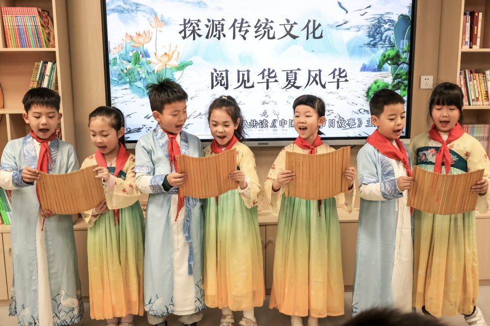 4月2日,湖北省武漢市洪山區(qū)未來(lái)實(shí)驗(yàn)小學(xué)美林校區(qū)學(xué)生在吟誦古詩(shī)。新華社發(fā)(趙軍攝)