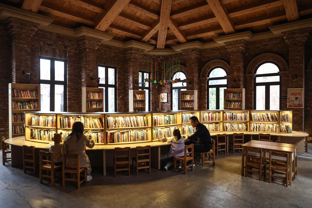 4月17日,小朋友在家長(zhǎng)的陪同下在沈陽(yáng)市鐵西區(qū)奉天工場(chǎng)文創(chuàng)園內(nèi)的城市書房?jī)?nèi)讀書。新華社記者 潘昱龍 攝