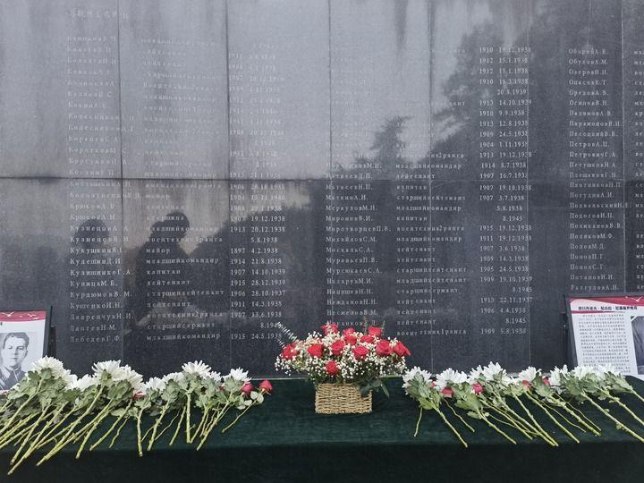 在南京抗日航空烈士紀(jì)念館鐫刻有蘇聯(lián)籍抗日航空英烈名錄的紀(jì)念碑前,擺放著人們獻(xiàn)上的鮮花(2024年11月22日攝)。新華社記者 邱冰清 攝