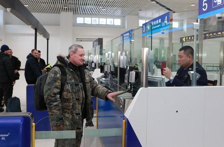 2024年12月10日,在黑河公路口岸旅檢大廳,黑河出入境邊防檢查站民警為首班次客車(chē)入境旅客辦理邊檢通關(guān)手續(xù)。當(dāng)日,中國(guó)黑河公路口岸—俄羅斯卡尼庫(kù)爾干公路口岸旅客運(yùn)輸正式開(kāi)通。新華社發(fā)(劉松攝)