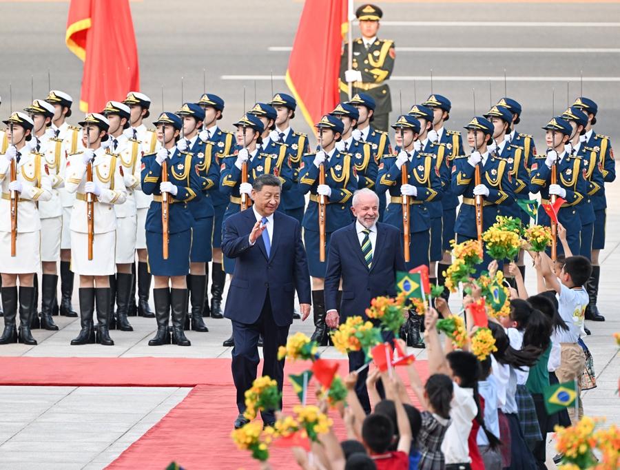5月13日下午,國家主席習近平在北京人民大會堂同來華進行國事訪問的巴西總統(tǒng)盧拉舉行會談。這是會談前,習近平在人民大會堂東門外廣場為盧拉舉行歡迎儀式。新華社記者 饒愛民 攝