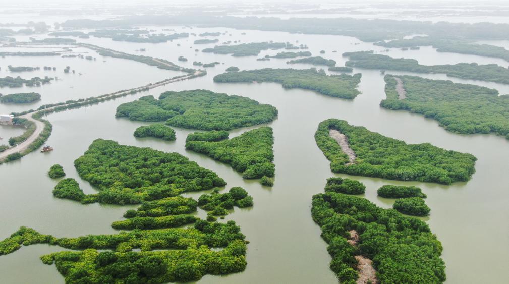 這是2023年4月10日拍攝的廣東湛江紅樹林國(guó)家級(jí)自然保護(hù)區(qū)麻章金牛島片區(qū)(無(wú)人機(jī)照片)。新華社記者 王瑞平 攝