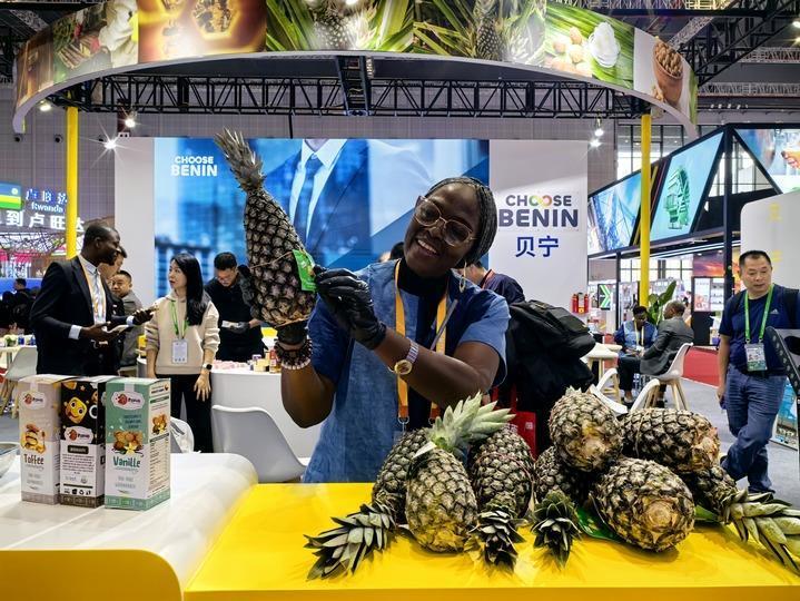 2024年11月7日,在上海舉行的第七屆中國國際進口博覽會上,貝寧國家館工作人員展示本國特色農產品——貝寧菠蘿。新華社記者 郝王樂 攝