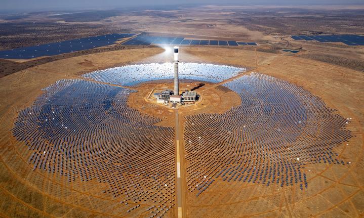 這是2024年8月20日在南非北開普省拍攝的由中國電建集團山東電建三公司承建的南非紅石100兆瓦塔式熔鹽光熱電站項目(無人機照片)。新華社記者 張譽東 攝