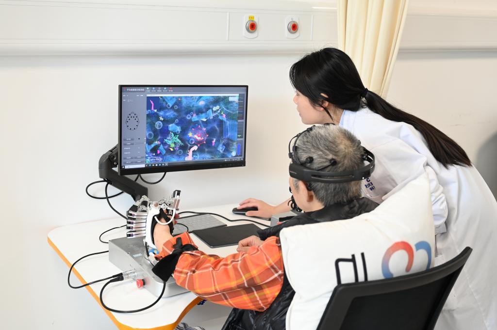 重慶市第五人民醫(yī)院的腦機接口康復治療室里,因腦卒中上肢癱瘓的老吳頭戴非侵入式腦機接口裝置,左手在外骨骼機械手臂輔助下完成伸展、合攏……