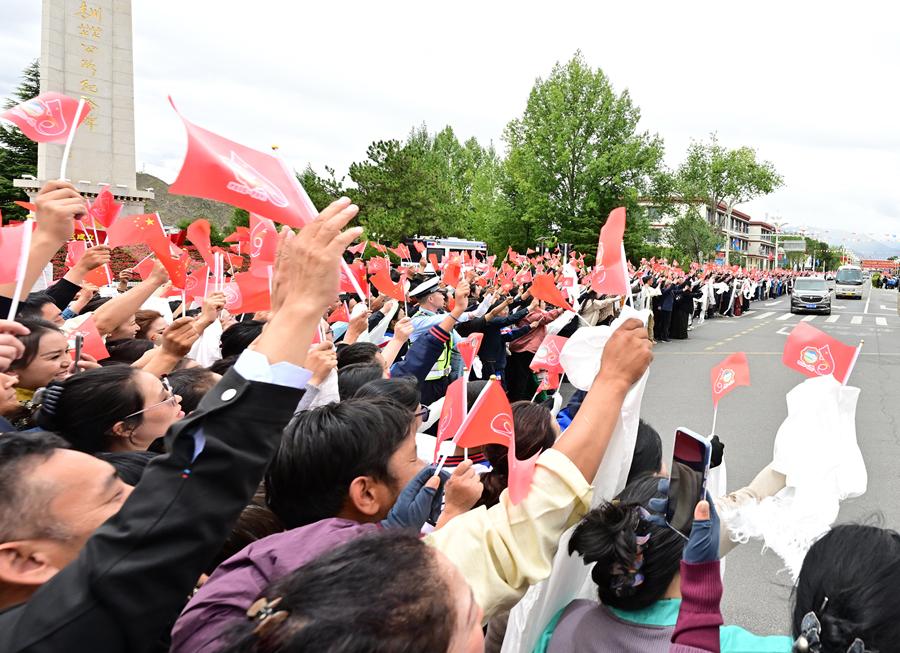 人群如潮水涌到道路兩旁,揮舞紅旗、手捧哈達,高呼“扎西德勒”,聲聲祝福是“感恩總書記、感恩黨中央”的由衷表達。習(xí)近平總書記拉開車窗,微笑著向人群揮手致意。