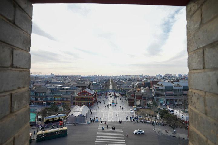 2024年12月26日,從正陽門箭樓內(nèi)向南拍攝的北京前門大街和遠(yuǎn)處的永定門城樓。新華社記者 鞠煥宗 攝