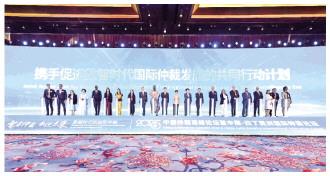 圖為多國仲裁界人士在論壇主席臺發(fā)布《攜手促進數(shù)智時代國際仲裁發(fā)展的共同行動計劃》。 貿仲供圖