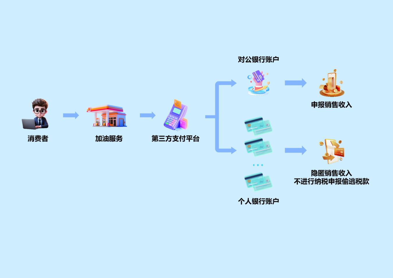經(jīng)過比對(duì),發(fā)現(xiàn)上述收銀憑證所記載的收銀信息與該加油站的對(duì)公賬戶銀行流水記錄不符。檢查人員隨即圍繞這一關(guān)鍵疑點(diǎn)深入核查,逐步鎖定關(guān)聯(lián)證據(jù),形成了完整的證據(jù)鏈。最終成功還原了案件的事實(shí)與真相:該加油站通過在第三方收款平臺(tái),綁定個(gè)人賬戶接收加油款項(xiàng),以此規(guī)避對(duì)公賬戶核算,試圖掩蓋真實(shí)銷售數(shù)據(jù),形成了一條隱蔽的賬外收款鏈條。