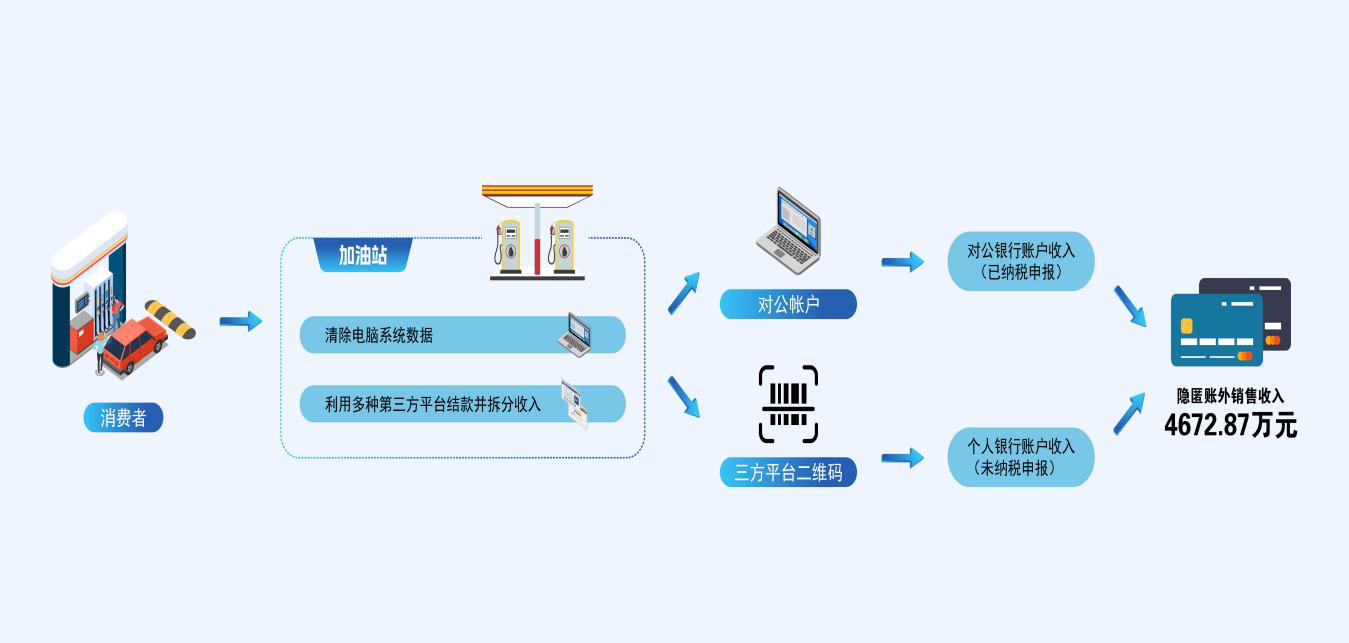 經(jīng)進(jìn)一步調(diào)查,該加油站實(shí)際上綁定了兩個(gè)第三方支付平臺,雖然平臺交易記錄僅保留部分月份的收款金額,但這些金額遠(yuǎn)遠(yuǎn)大于加油站日常申報(bào)金額。至此,檢查人員初步掌握了該加油站隱匿銷售收入、未依法申報(bào)的證據(jù)。