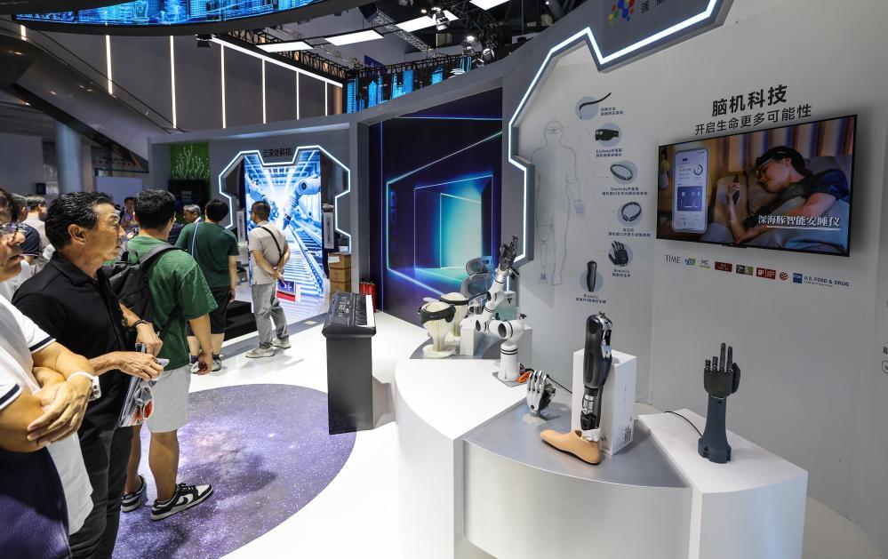 9月25日,在第四屆全球數(shù)字貿(mào)易博覽會數(shù)智未來主題展區(qū)的杭州六小龍專區(qū),觀眾在觀看強腦科技的智能仿生手。新華社記者 徐昱 攝