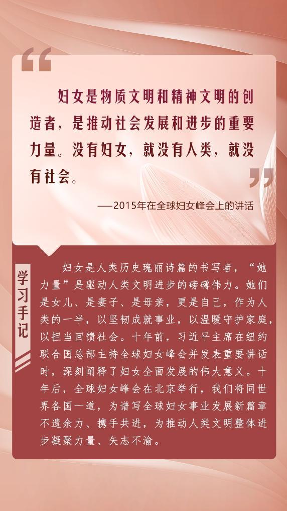 在全球婦女峰會(huì)即將舉行之際,我們重溫習(xí)近平總書(shū)記的重要論述,共同展望婦女發(fā)展的美好未來(lái),期待全球婦女事業(yè)發(fā)展譜寫(xiě)新的絢爛篇章。