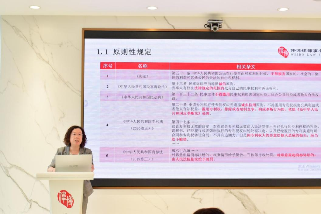 2025年9月5日,由北京市偉博律師事務(wù)所(以下簡稱“偉博律所”)主辦的“知識(shí)產(chǎn)權(quán)惡意訴訟疑難問題與實(shí)務(wù)研究”講座在北京CBD陽光金融中心偉博律所北京總部舉辦。偉博律所高級合伙人范秀霞律師擔(dān)任主講人,從法律規(guī)定、認(rèn)定標(biāo)準(zhǔn)、司法實(shí)踐、國際比較及實(shí)務(wù)建議五個(gè)方面系統(tǒng)梳理了惡意訴訟的現(xiàn)狀與挑戰(zhàn)。