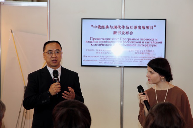 張洪波在介紹“中俄互譯出版項(xiàng)目”的影響與前景時(shí)強(qiáng)調(diào),該項(xiàng)目吸引了兩國(guó)多位資深翻譯家的參與,多位翻譯家因此獲得兩國(guó)政府部門(mén)頒發(fā)的翻譯獎(jiǎng)?!侗本┩韴?bào)》連載北大出版社出版的《魔鬼的靈魂》(作者:葉甫蓋尼?希什金,譯者:溫玉霞)43天,是1991年以來(lái)中國(guó)媒體連載俄羅斯文學(xué)作品時(shí)間最長(zhǎng)的一次。南開(kāi)大學(xué)谷羽教授翻譯的《詩(shī)國(guó)三高峰,輝煌七百年——唐詩(shī)宋詞元曲選》和《風(fēng)的形狀——中國(guó)當(dāng)代詩(shī)選》入選國(guó)家出版十三五規(guī)劃,獲得國(guó)家出版基金資助即將在天津大學(xué)出版社出版漢俄對(duì)照版。由文著協(xié)代理,入選該項(xiàng)目的諾貝爾文學(xué)獎(jiǎng)獲得者莫言的劇本《我們的荊軻》將在11月圣彼得堡“國(guó)際文化論壇”期間上演。近年來(lái),文著協(xié)利用參加國(guó)際會(huì)展、國(guó)際文學(xué)和版權(quán)交流活動(dòng),向國(guó)內(nèi)外多家機(jī)構(gòu)贈(zèng)書(shū),宣傳介紹該項(xiàng)目成果,獲得良好社會(huì)反響。