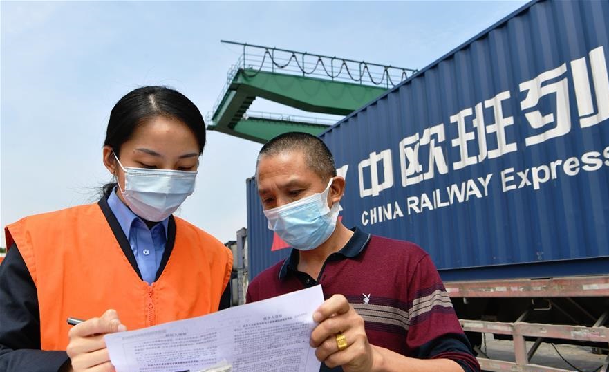 4月25日,中國鐵路南昌局集團有限公司海滄站貨運員李瑩(左)在廈門海滄站和發(fā)貨方代表辦理中歐班列貨物進站交接手續(xù)。 當日,中歐班列X8098次貨物列車從福建廈門海滄站出發(fā),開往德國漢堡。這趟中歐班列搭載50個40尺標準集裝箱,裝有一次性防疫口罩、簡易呼吸器、輸液器、防護服等約468萬件防疫物資,以及服裝、電子產(chǎn)品等貨物。 據(jù)中國鐵路南昌局集團有限公司數(shù)據(jù)統(tǒng)計,2020年第一季度,漳州車務段海滄站已累計開行中歐班列66列,裝車3014輛,貨物價值約2億美元;與2019年同期相比,開行列數(shù)增長88%,裝運量增長196%,運輸收入增長219%。 新華社記者 魏培全 攝