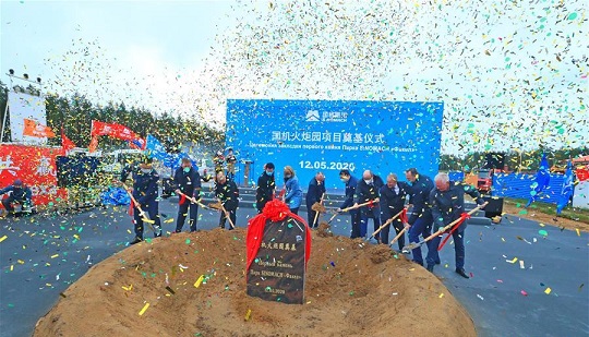 5月12日,在白俄羅斯首都明斯克郊區(qū)的中白工業(yè)園,中白雙方代表參加國(guó)機(jī)火炬園項(xiàng)目奠基儀式。 新華社發(fā)(任科夫攝)