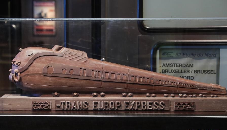 這是12月15日在比利時(shí)布魯塞爾火車(chē)世界博物館拍攝的一件藝術(shù)家以全歐快車(chē)為原型而創(chuàng)作的巧克力火車(chē)雕塑。