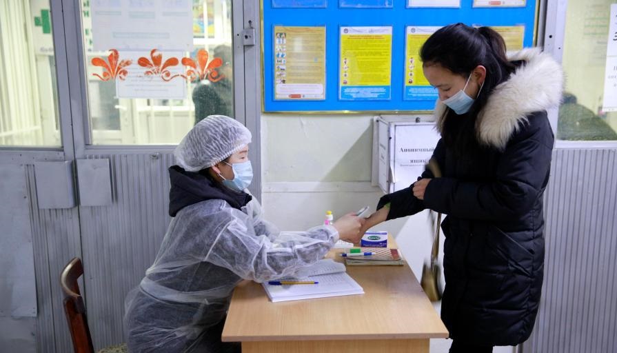 12月23日,在吉爾吉斯斯坦比什凱克,一名市民(右)到一家醫(yī)藥中心問診時(shí)接受體溫檢測。