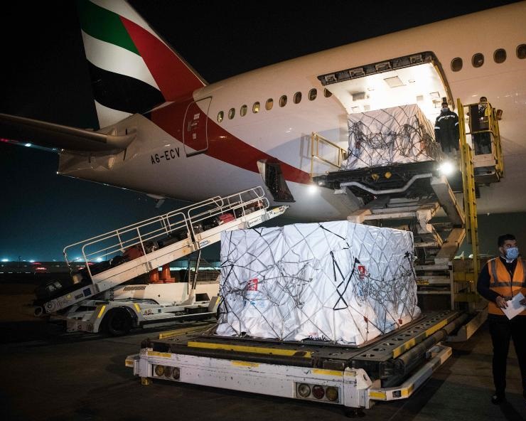 12月10日,在埃及開羅國際機(jī)場,工作人員運(yùn)輸中國研制生產(chǎn)的新冠疫苗。新華社記者鄔惠我攝