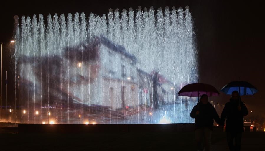 1月2日,在克羅地亞薩格勒布,人們經(jīng)過投射有遭地震損毀的彼得里尼亞街頭影象的噴泉。新華社發(fā)(馬爾科·普爾皮奇攝)