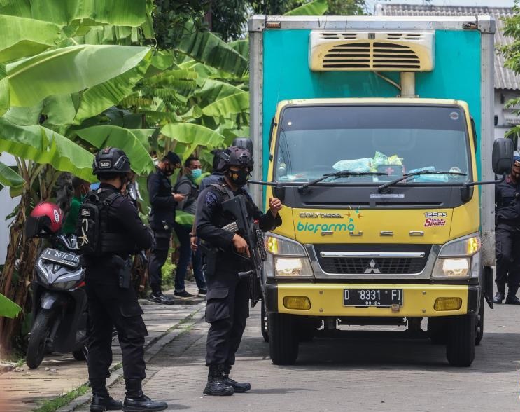 1月4日,在印度尼西亞?wèn)|爪哇省泗水市,當(dāng)?shù)鼐熳o(hù)送裝有新冠疫苗的車(chē)輛。