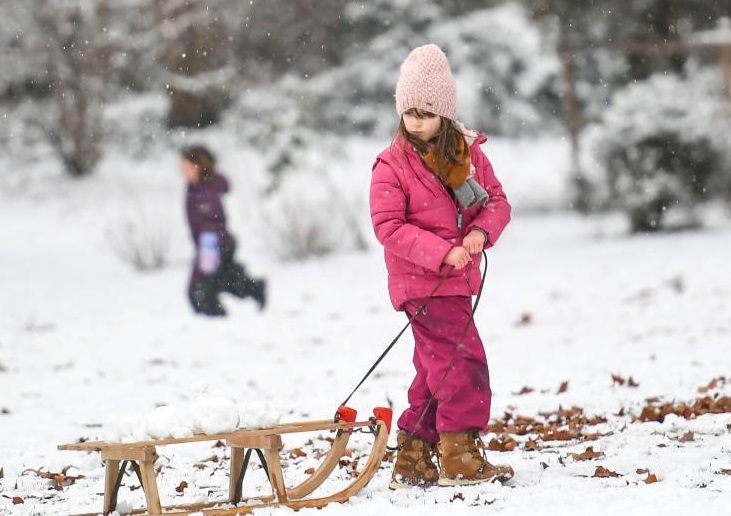 當(dāng)日,德國法蘭克福市降雪。不少家長帶著孩子來到戶外,盡享雪趣。