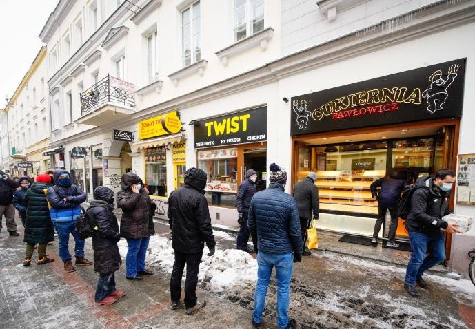 2月11日,顧客在波蘭首都華沙的一處面包房外排隊(duì)等待購(gòu)買(mǎi)甜面包。