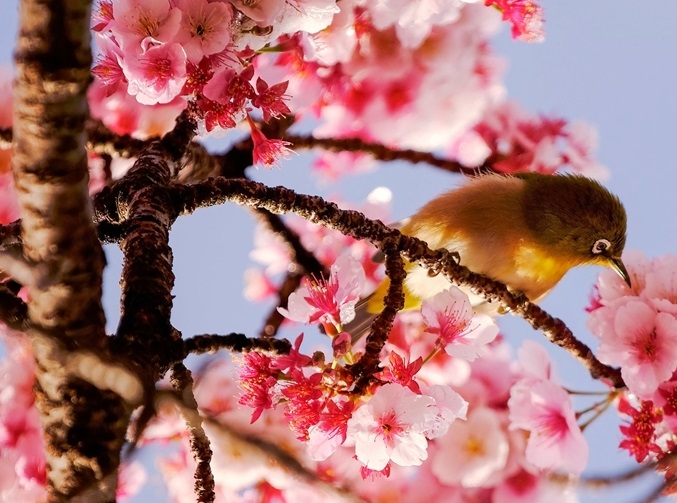 日本早櫻盛開 鳥兒枝頭嬉戲