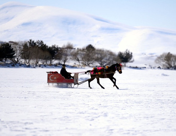 土耳其天寒地凍 冰湖上坐馬車(chē)愜意十足