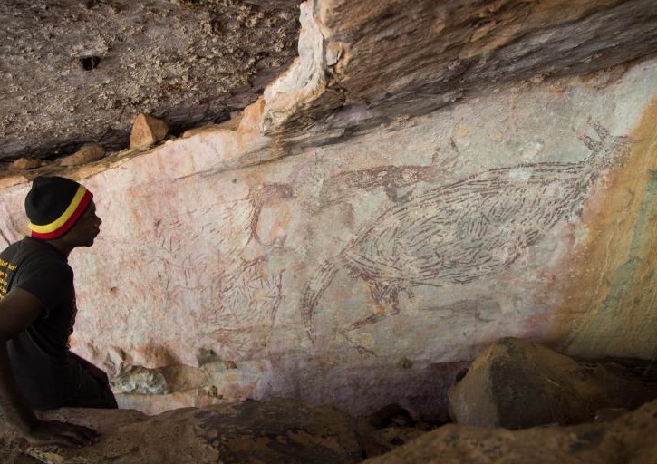這張2016年7月15日拍攝的資料照片顯示,在澳大利亞金伯利地區(qū),一名原住民觀看袋鼠巖畫。