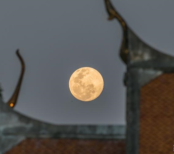 2月26日,一輪圓月從泰國曼谷大王宮建筑群背后升起。